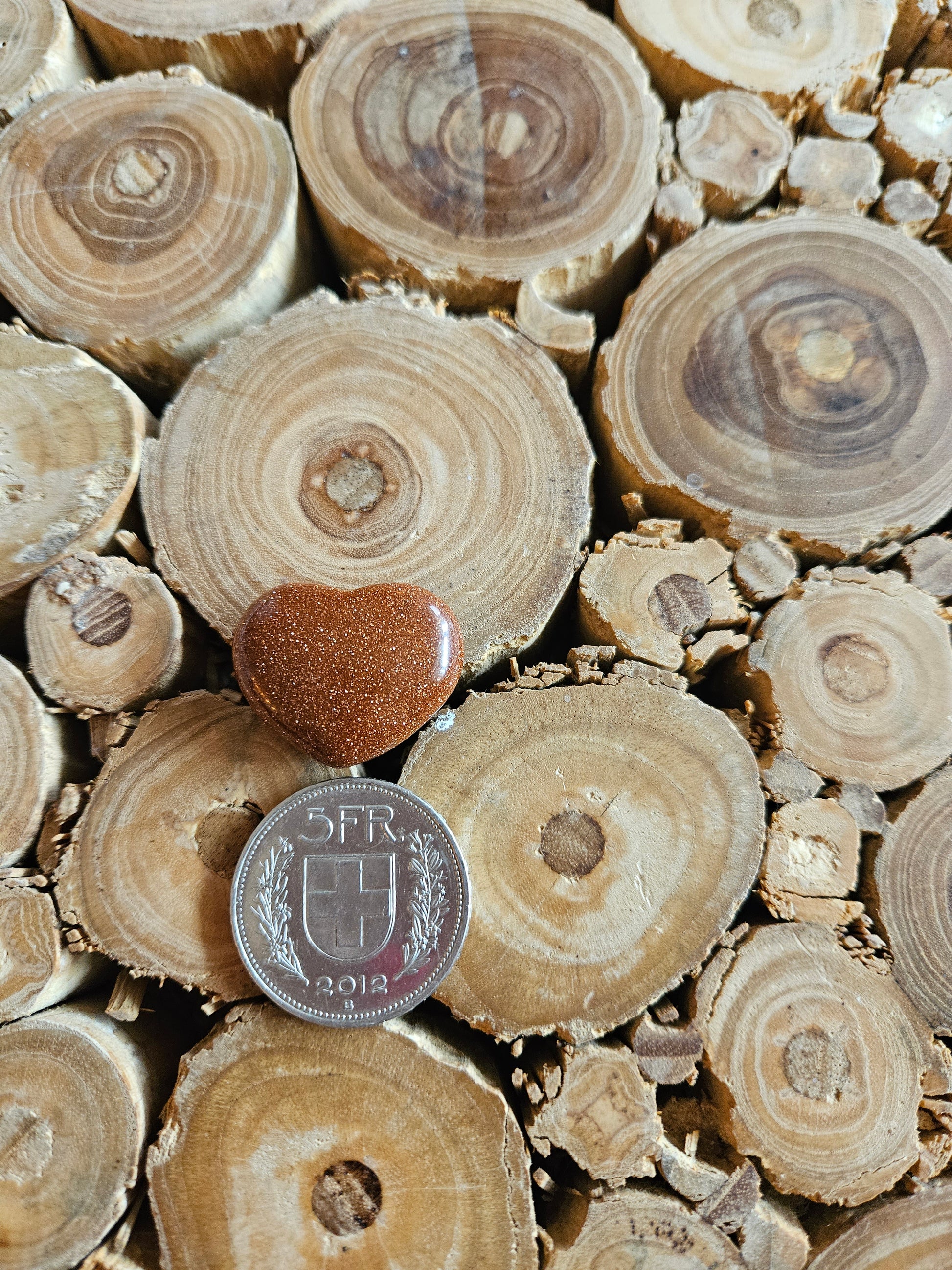 Ein Meisterwerk der Natur: Unser Herz-Stein aus Goldfluss wird aus echtem Goldfluss gefertigt, einem Stein mit schillernden Partikeln im Inneren. Jeder Stein ist ein individuelles Kunstwerk der Natur, das seine eigene Farbvariation und Musterung aufweist.